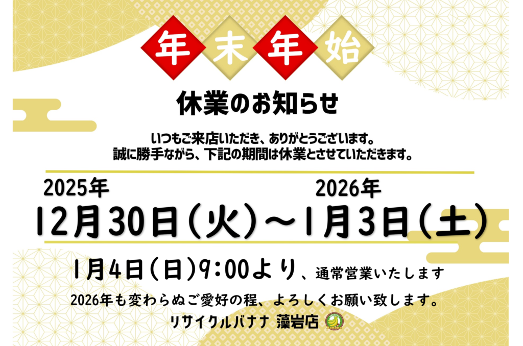 さて、当店舗では誠に勝手ながら、下記の期間を年末年始休業とさせていただきます。